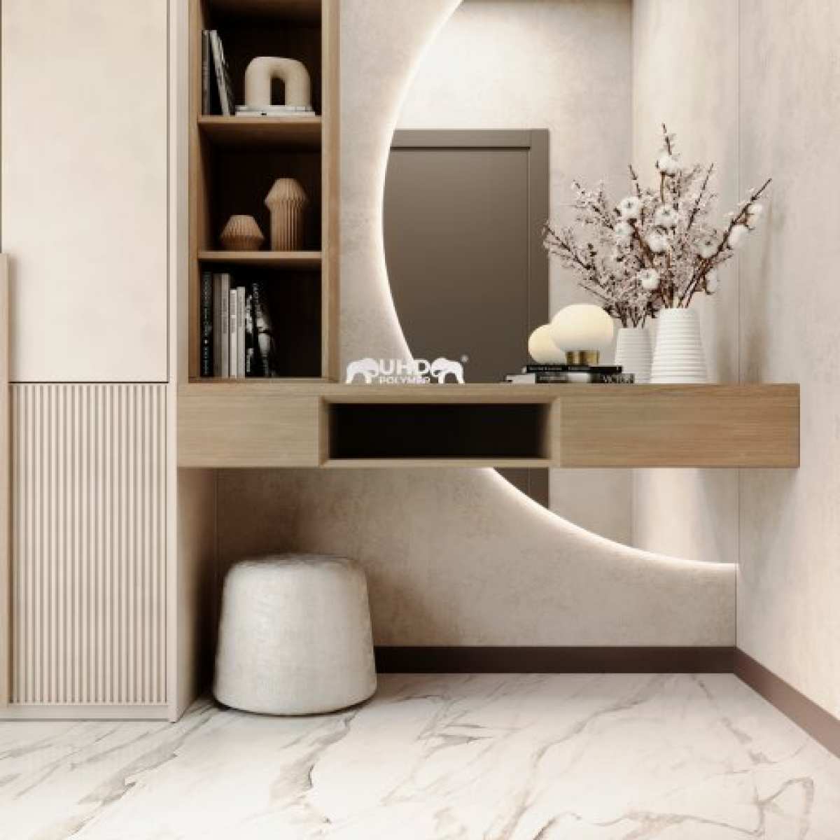 Используется для изготовления плинтусов, молдингов, декоративных элементов в интерьере. Отличается долговечностью и возможностью покраски.