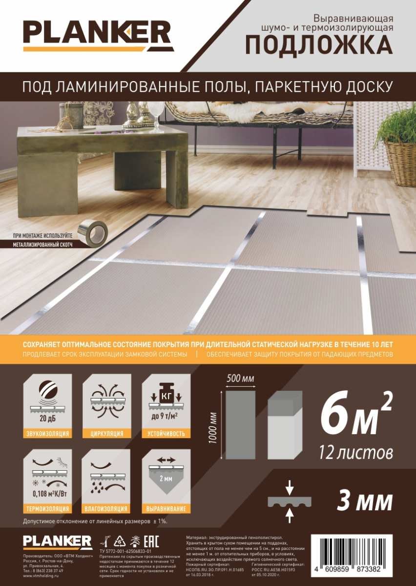 Подложка Подложка Planker из экструдированного пенополистирола, листовая 3 мм